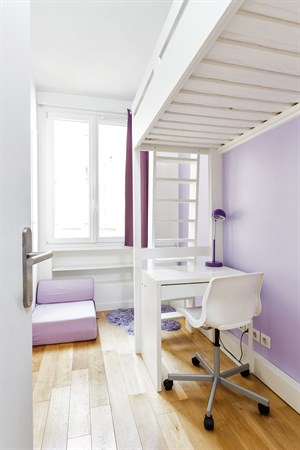 D'une surface de 71 m2, le Vaugirard s'ouvre sur une pièce principale lumineuse avec son beau balcon filant et sa cheminée ancienne. L'espace salon vous permettra de vous détendre après une journée de rendez-vous professionnels. Ouverte sur le séjour, la cuisine est entièrement équipée pour vous restaurer sur place, en famille ou entre amis. La première chambre, parentale, est dotée d'un coin bureau et d'un grand placard de rangements pour vos effets personnels avec sa propre salle de douche. La seconde chambre aux tons violets se compose d'un lit simple en mezzanine. La troisième chambre aux tons rouges dispose également d'un lit en mezzanine et d'une banquette supplémentaire. Une salle de bains supplémentaire avec baignoire et WC complète ce bien contemporain.